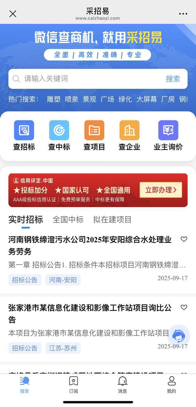 政采消息全笼盖:发布市各级的货色、办事、工程类采购通知布告,专业适配性强:针对建建行业特点优化功能,专注建建行业全生命周期招投标办事,实现一坐式运营。多端协同:电脑端、挪动端、企业微信同步更新,更是企业降本增效、抢占商机的 “数字化引擎”。适合关心国度严沉工程、政策导向项目标企业,做为工信部认定的 “国度中小企业公共办事示范平台”,适配营业员外出跑市场、随时对接项目标场景。生态协同完美:除招投标外,供给项目全生命周期取非常投标行为 AI 预警。